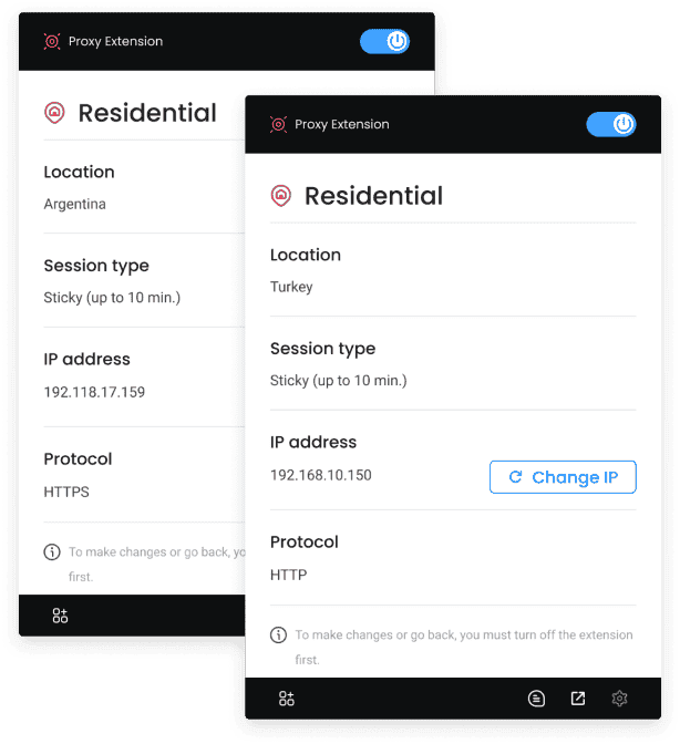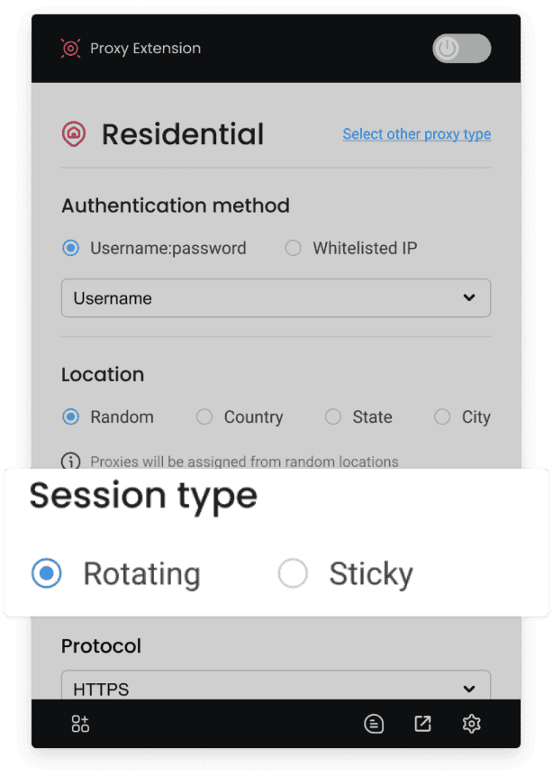 不需要,我们已经为你准备好了。通过我们的扩展,你不仅可以获得流畅、有趣且与暗模式兼容的体验,而且还可以获得轮换代理会话。这意味着你只需选择一个轮换会话,你的 IP 地址将在每次连接时切换。放弃那个代理更换器,你比那个更聪明。