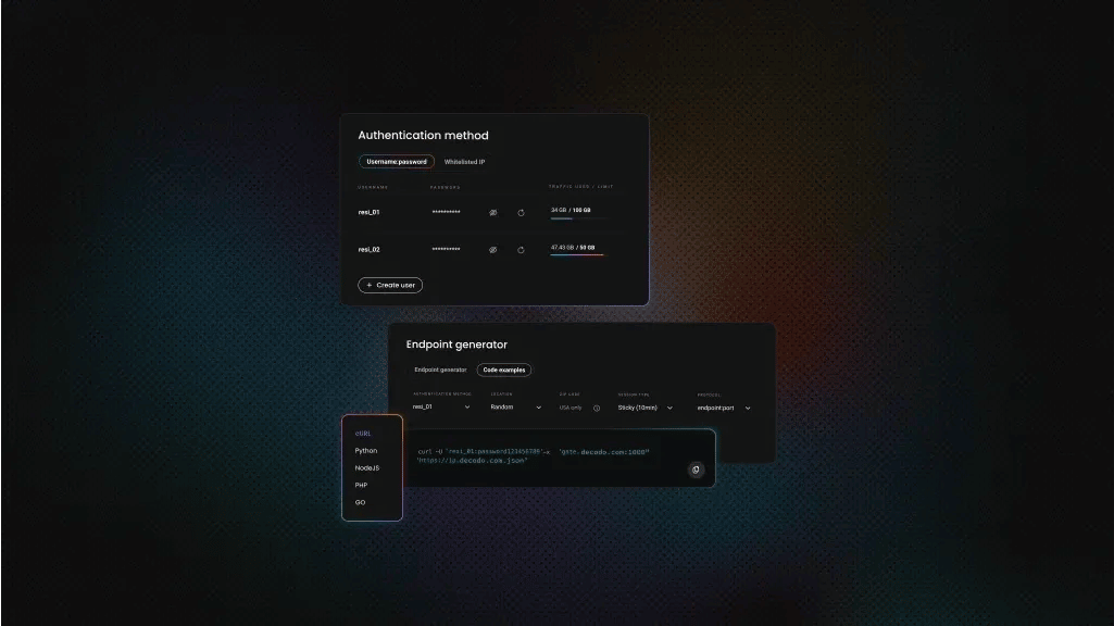 - API集成:Decodo提供HTTP(S)和SOCKS5协议,可与数据收集工具和AI训练管道无缝集成。