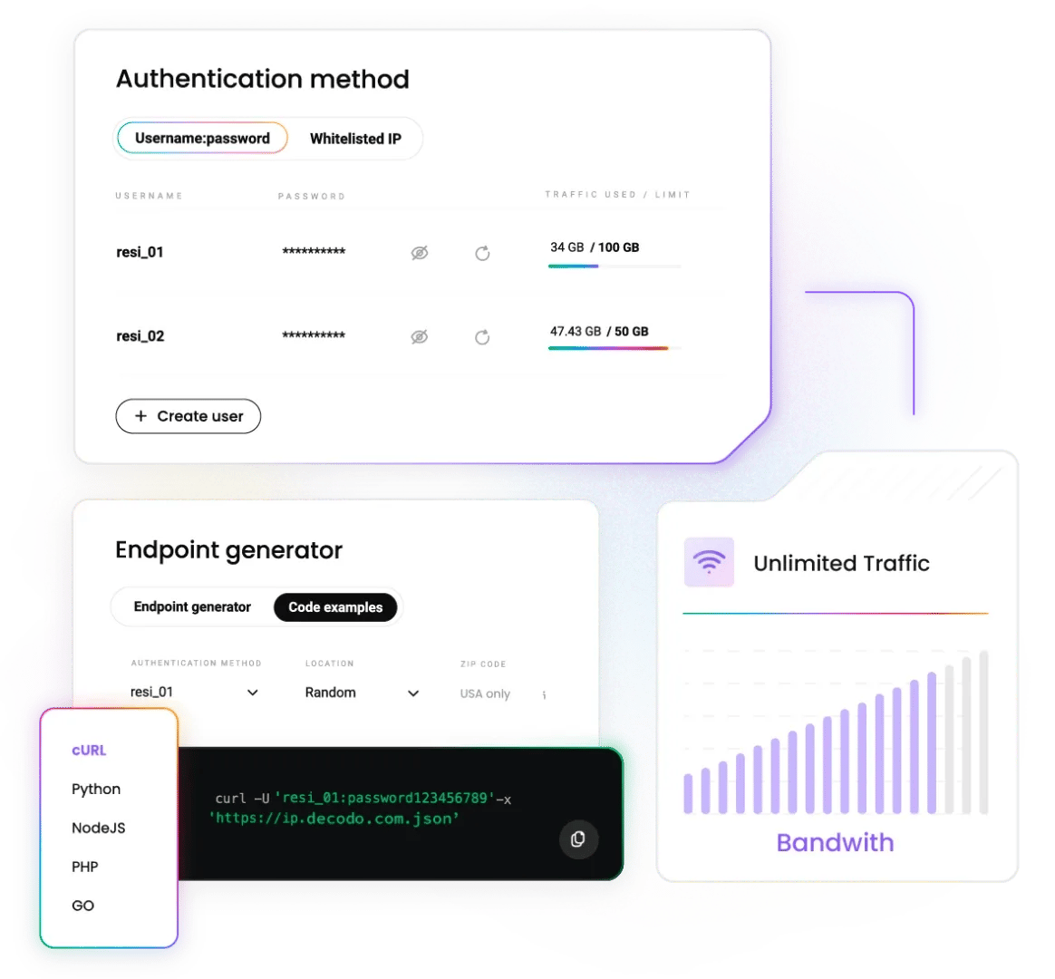 Decodo的无限代理处理流量层,让您专注于成果。团队可通过以下方式部署: