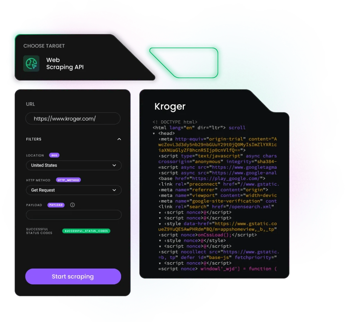 我们的网页抓取 API 是一款强大的数据收集器,它将网页抓取与超过 1.25 亿个住宅、移动、静态住宅和数据中心代理池相结合。您只需使用它们,即可从 Kroger 收集最新的产品数据。