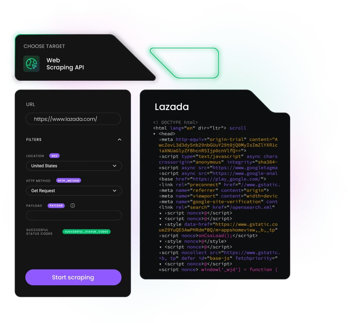 使用我们的 Lazada 数据抓取工具 API,您只需发送一个请求即可获取所需的 HTML 格式数据。即使请求失败,我们也会自动重试,直到数据交付完成——您只需为成功的请求付费。