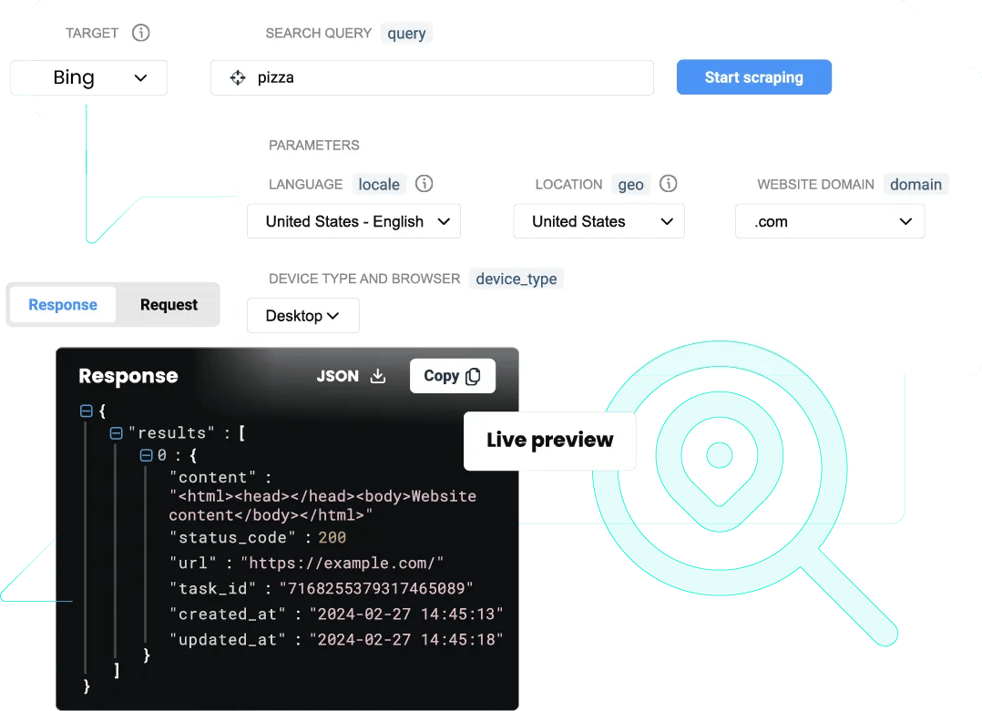 使用我们强大的 API,轻松抓取 Bing 搜索结果。从灵活的输出选项到内置代理集成,我们都能确保无缝数据收集,而无需屏蔽或验证码。