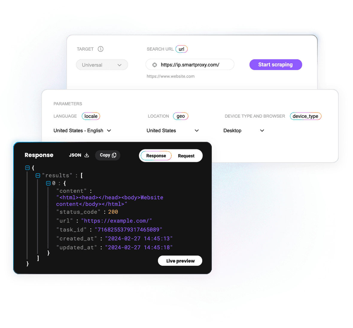 为了限制被阻止或隐藏的机会,您应该避免使用单个 IP 地址抓取同一网站,并使用 Decodo 网络来扩展您的运营。所有计划均包括代理轮换。